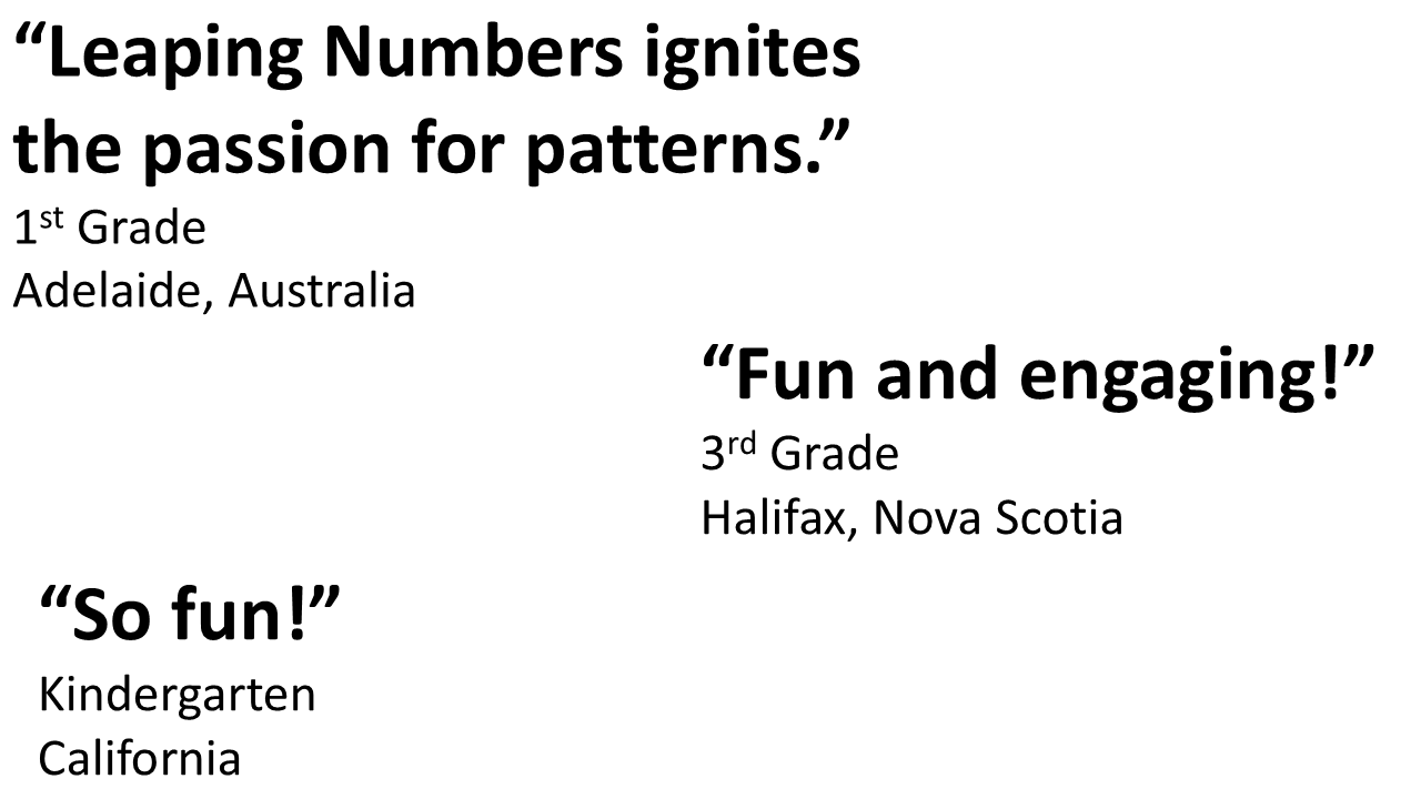 While it’s not necessary to see the videos the day they come out – after all, many of you are reading this after the season has concluded, and Leaping Numbers works really well at any time – there is something very fun about watching them during the season. It’s fun to be part of an event, knowing that many other classes around the world are also watching them at the same time. Many classes are racing to see who can find the Mystery Number first. This also makes it fun to invite other classes in your school to join Leaping Numbers so you can talk about the latest pattern that has come out – and predict what might be next!