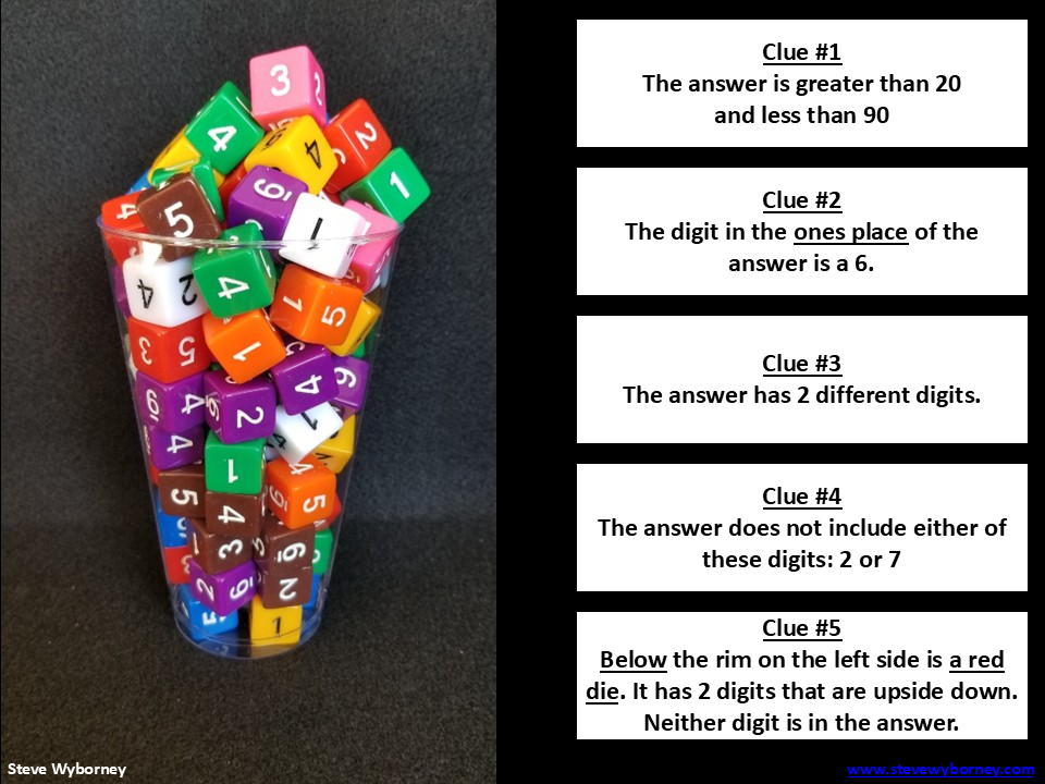 BONUS NOTE: “Do You See the Final Clue” has a fun variation! The 4th clue will ask you to find a digit seen in the top of the picture, but to save that information until the next clue. It’s one of the few Esti-Mystery clues that does not eliminate any numbers – at least not right away!