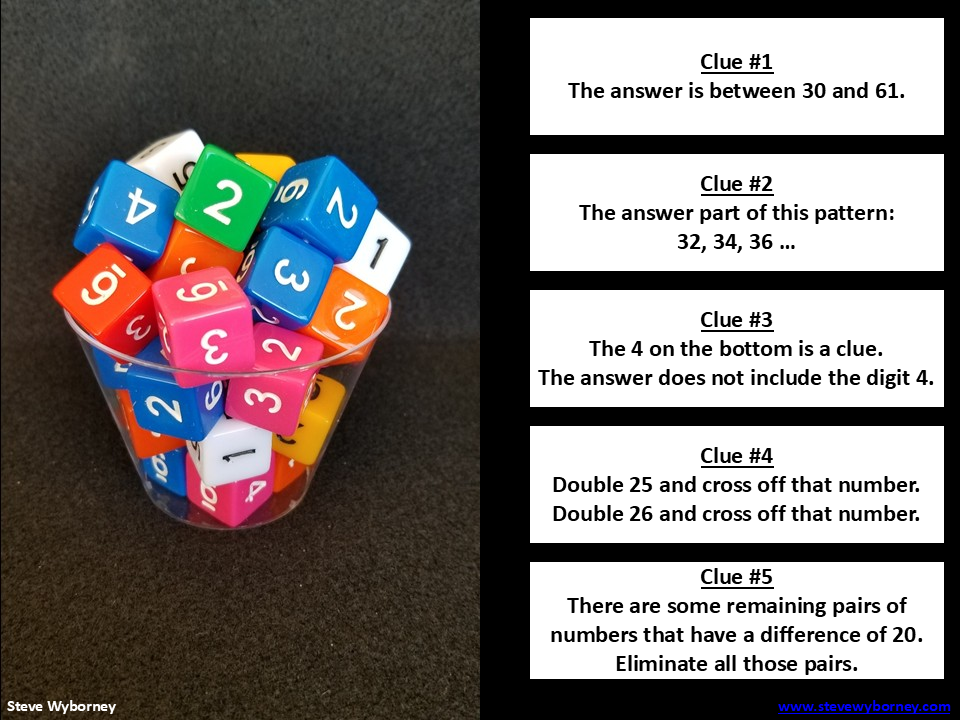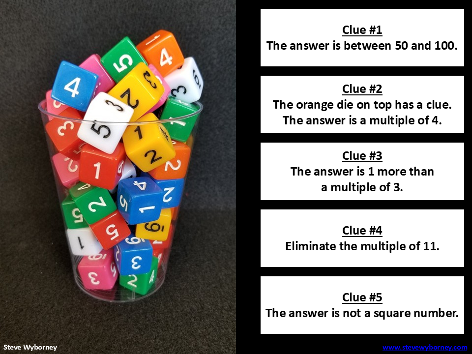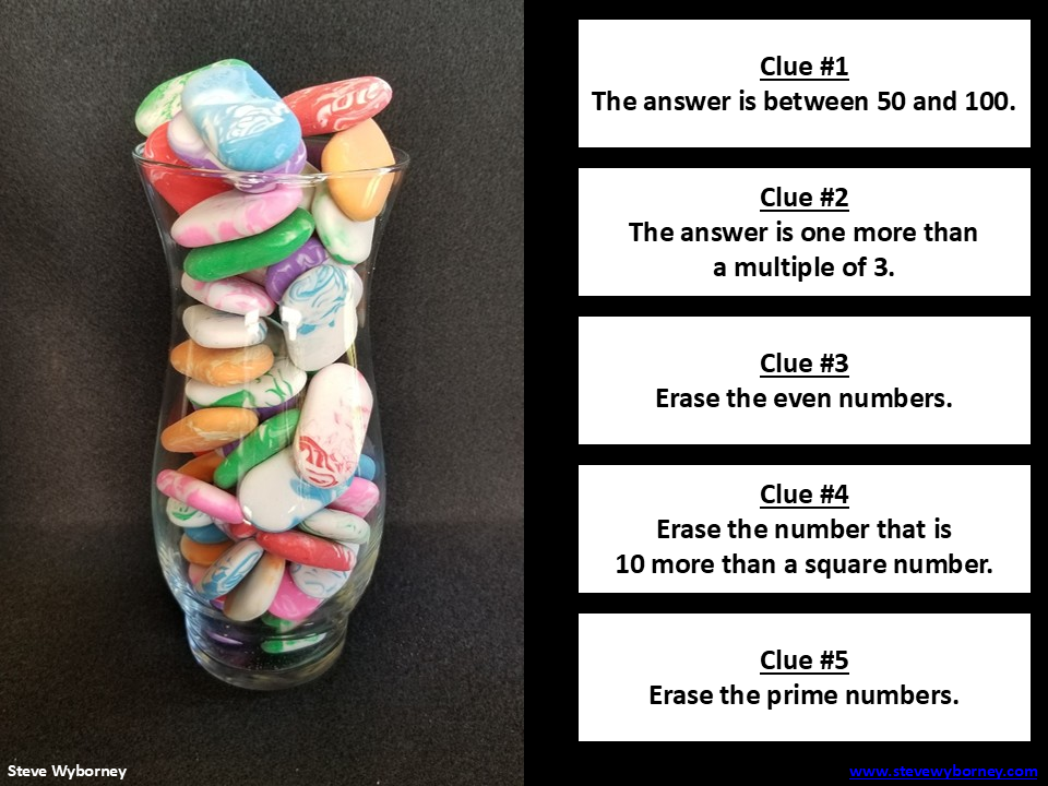 Bonus Note: My favorite clue in this Esti-Mystery is clue #4 because it lets me eliminate the composite numbers. Those numbers are actually fairly easy to find by determining which of the remaining numbers are divisible by either 3 or 5.